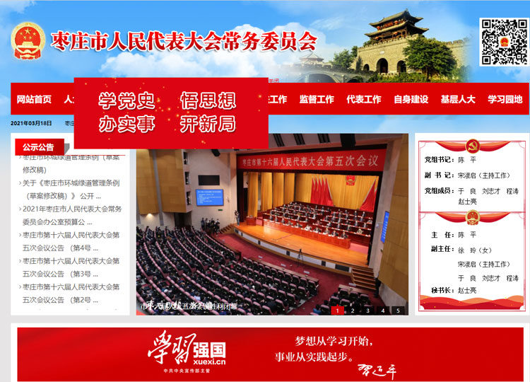 棗莊市人民代表大會是棗莊市的國家權力機關。 棗莊市人民代表大會每屆任期五年,每年至少舉行一次會議。會議由市人大常委會召集。經過五分之一以上代表建議,可以臨時召集市人民代表大會會議。1960年,棗莊市人民代表大會建立,并召開了棗莊市第一屆人民代表大會第一次會議。 棗莊市人民代表大會行使下列職權:在本行政區(qū)域內,保證憲法、法律、行政法規(guī)和上級人民代表大會及其常委會決議的遵守和執(zhí)行,保證國家計劃和國家預算的執(zhí)行;審查和批準本市的國民經濟和社會發(fā)展計劃、預算以及它們執(zhí)行情況的報告;討論、決定本市的政治、經濟、教育、科學、文化、衛(wèi)生、環(huán)境和資源保護、民政、民族等工作的重大事項;選舉市人大常委會的組成人員;選舉市長、副市長;選舉市監(jiān)察委員會主任、市中級人民法院院長和人民檢察院檢察長。選出的市人民檢察院檢察長,須報經省人民檢察院檢察長提請省人大常委會批準;選舉省人民代表大會代表;聽取和審查市人大常委會的工作報告;聽取和審查市人民政府、中級人民法院和人民檢察院的工作報告;改變或者撤銷市人大常委會的不適當?shù)臎Q議;撤銷市人民政府的不適當?shù)臎Q定和命令;保護社會主義的全民所有的財產和勞動群眾集體所有的財產,保護公民私人所有的合法財產,維護社會秩序,保障公民的人身權利、民主權利和其他權利;保護各種經濟組織的合法權益;保障少數(shù)民族的權利;保障憲法和法律賦予婦女的男女平等、同工同酬和婚姻自由等各項權利。 棗莊市第十六屆人民代表大會代表共有394名。市十六屆人大一次會議于2017年2月19日至23日舉行,決定設立市第十六屆人民代表大會法制委員會、內務司法委員會、財政經濟委員會、教育科學文化衛(wèi)生委員會、城鄉(xiāng)建設環(huán)境保護委員會、農業(yè)與農村委員會、民族僑務外事委員會。 棗莊市十六屆人大三次會議于2019年1月6日至9日舉行,決定增設棗莊市第十六屆人民代表大會社會建設委員會和更名棗莊市第十六屆人民代表大會內務司法委員會為棗莊市第十六屆人民代表大會監(jiān)察和司法委員會。 |