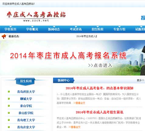 所屬行業(yè):教育 單位名稱:棗莊成人高考函授站-棗莊網(wǎng)站建設(shè)項(xiàng)目網(wǎng)站地址:http://www.zzck.net