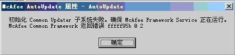 作為一名忠實(shí)的麥粉,多年來(lái)我一直使用McAfee這款殺毒軟件。但近一周開始McAfee出現(xiàn)無(wú)法更新的狀況,自動(dòng)更新和手動(dòng)更新都失敗,彈出錯(cuò)誤提示窗口的信息為“初始化Common Updater子系統(tǒng)失敗.確保McAfee Framework service正在運(yùn)行.McAfee Framework service返回錯(cuò)誤 ffffffdf @ 3”。